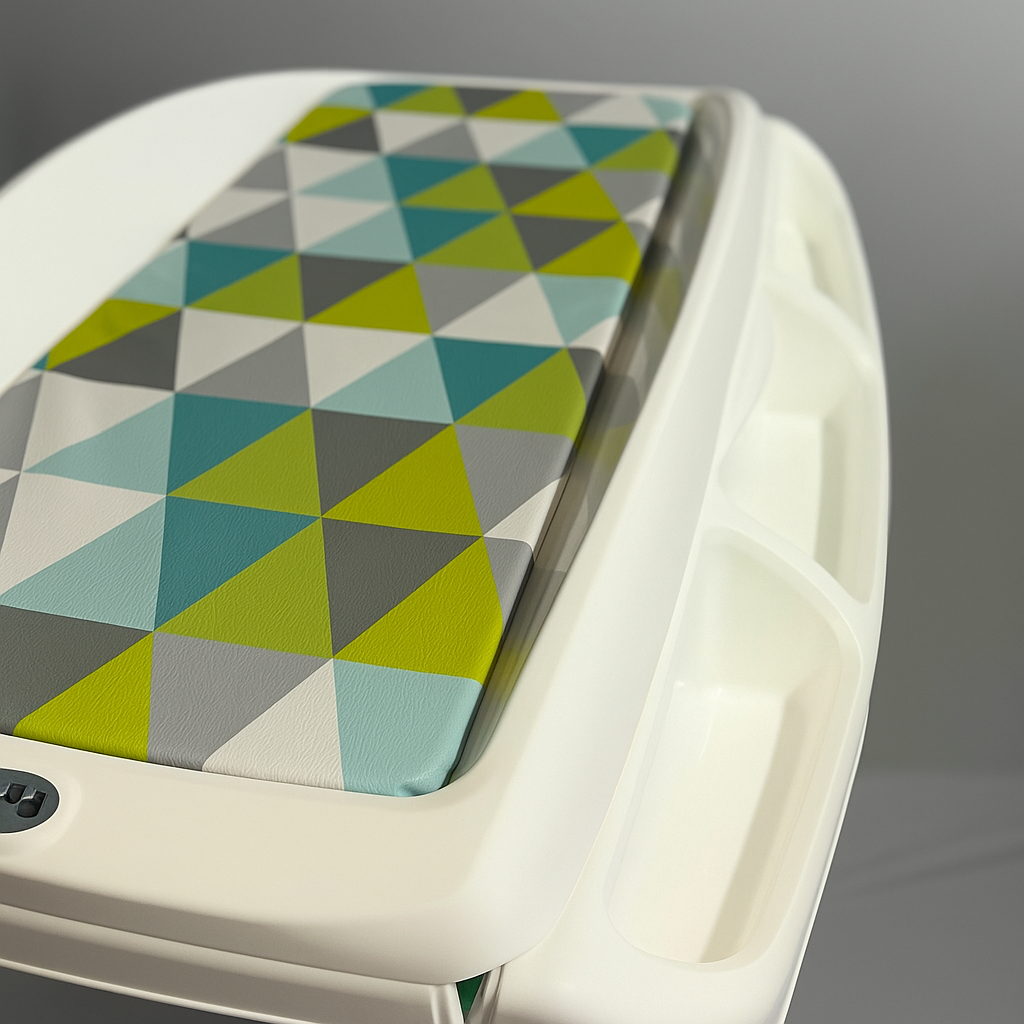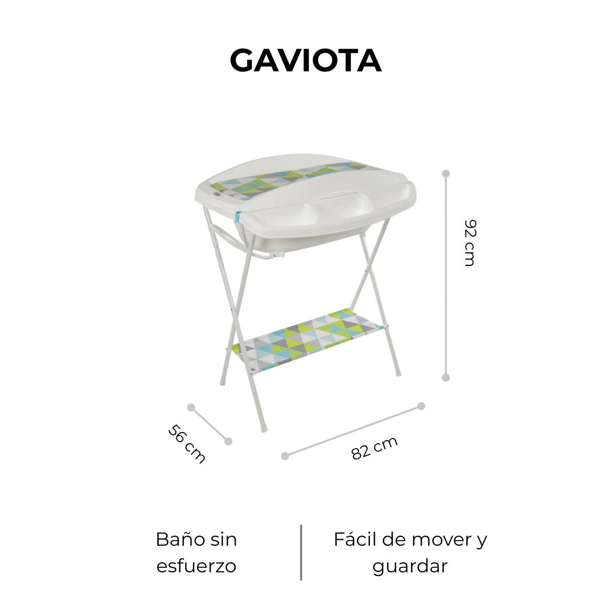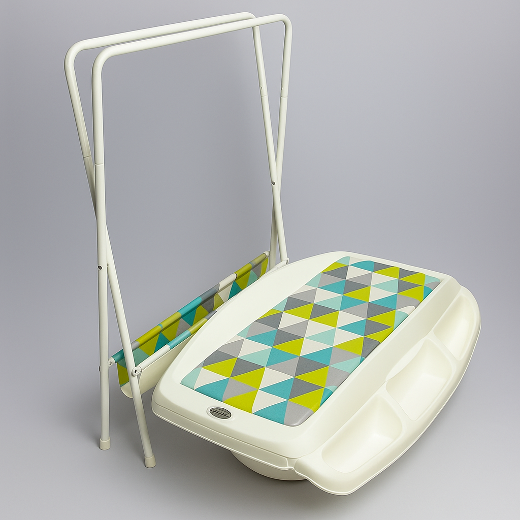 Incluye una tapa de tina que funciona como un práctico cambiador acolchonado, ideal para secar y vestir al bebé con total comodidad. Está instalada sobre un caballete metálico resistente, que incorpora un amplio compartimiento inferior para tener todo lo necesario siempre a mano.