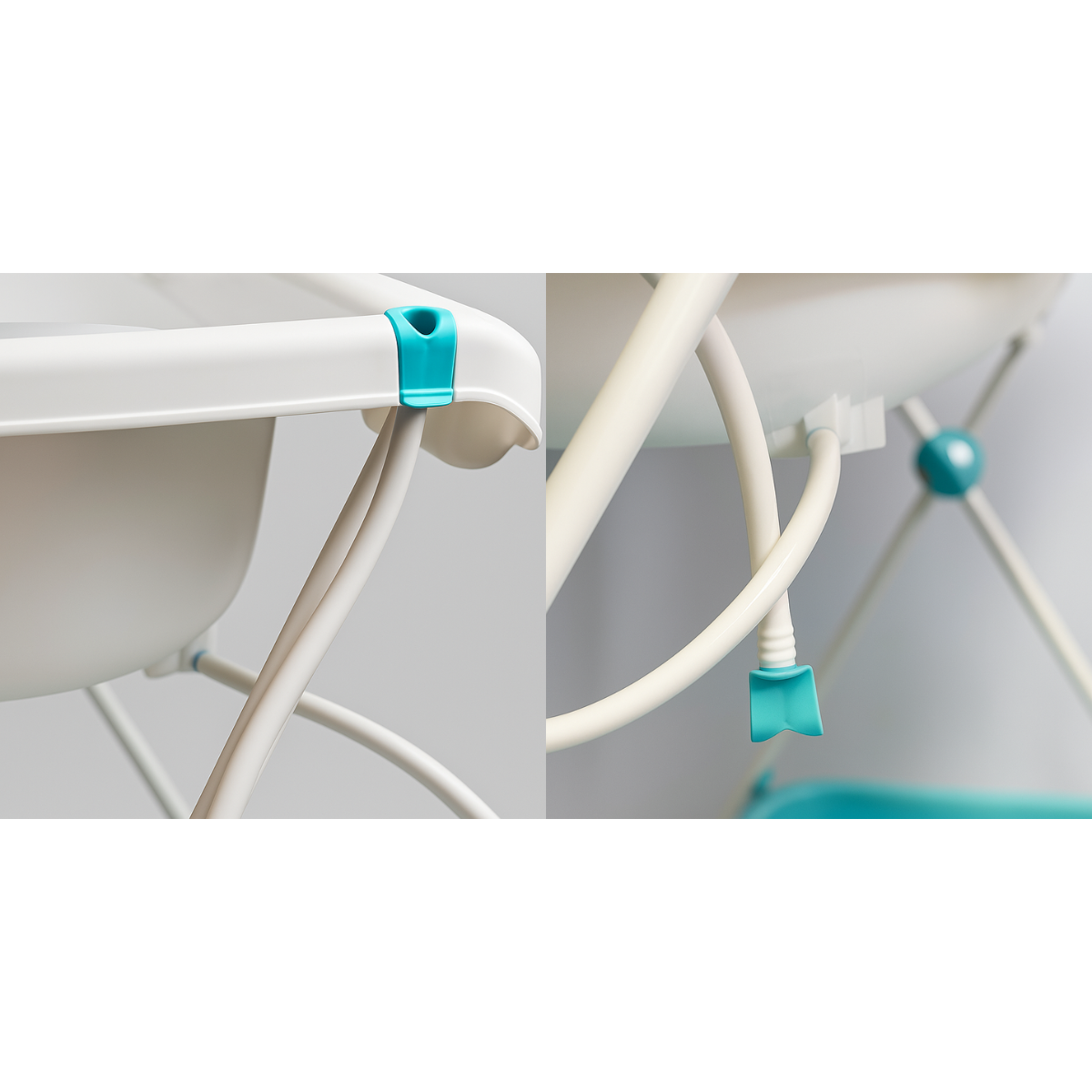 Cuenta con una confortable tina anatómica que incluye compartimientos para accesorios de baño y una manguera para el desagüe, ofreciendo mayor practicidad y organización.