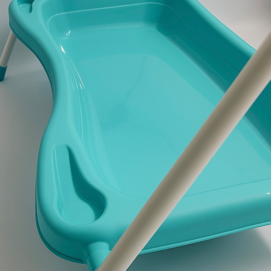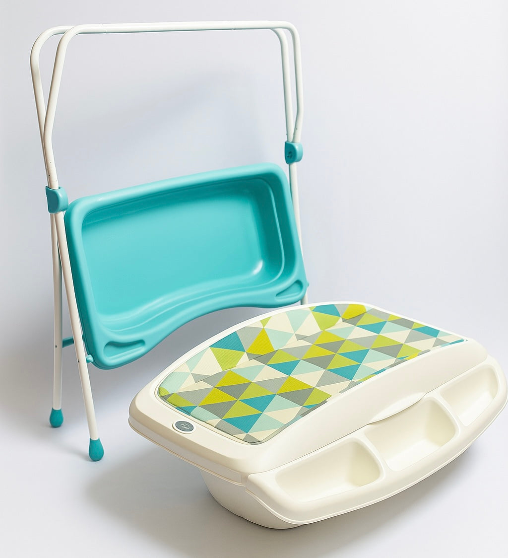 Instalada sobre un caballete metálico, la bañera incluye una amplia charola inferior para organizar los accesorios del bebé (ropita, talco, cremas, etc.), permitiéndote tener todo al alcance sin descuidarlo en ningún momento.