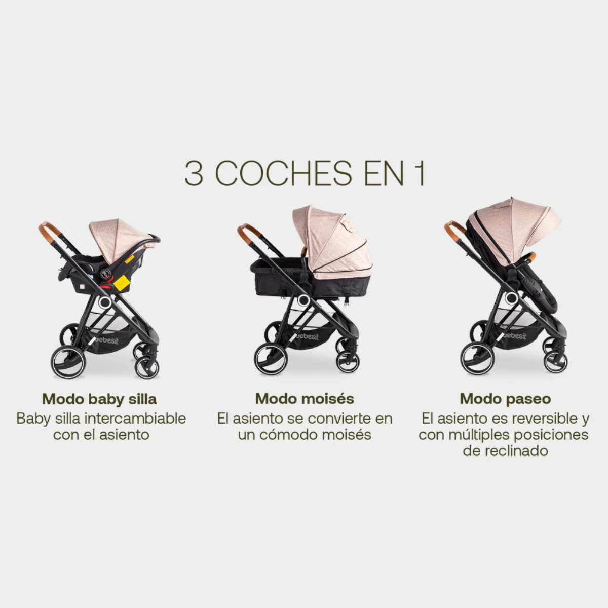 Baby silla para el auto incluida, intercambiable con el asiento del coche (adaptadores incluidos). Según la nueva norma, su uso es desde el nacimiento hasta 87 cm. Cuenta con arnés de seguridad de 3 puntas y sistema de ajuste automático de altura de apoyacabezas y arnés con un solo movimiento.