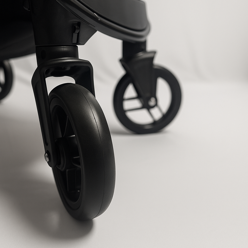 Ruedas delanteras giratorias 360º con traba de seguridad y suspensión para paseos suaves.