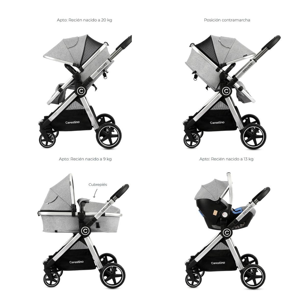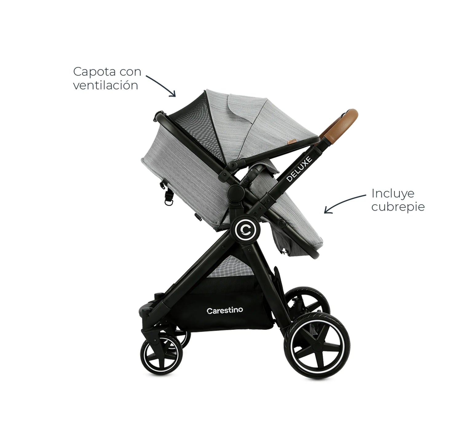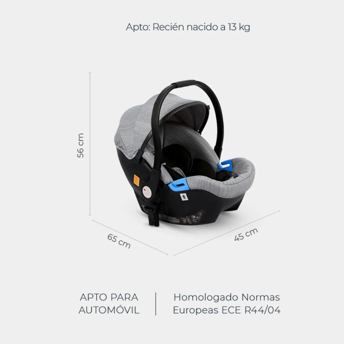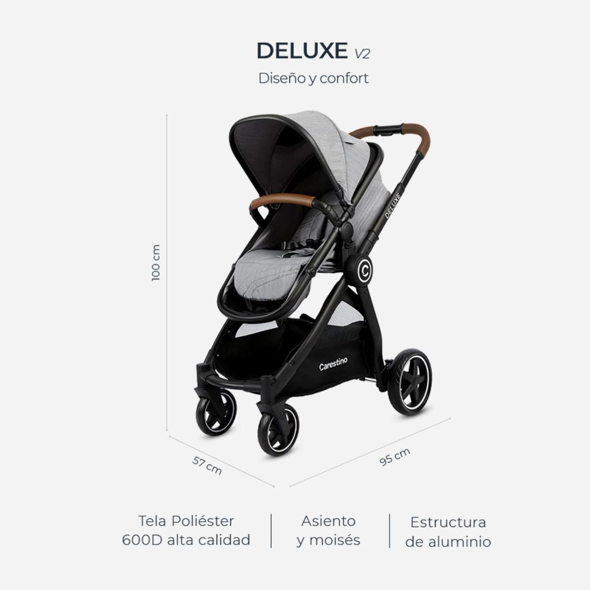 El cochecito DELUXE V2 tiene un asiento que se convierte en moisés en solo 3 pasos. Incluye un cubrepiés desmontable que protege al bebé del frío. Además, trae una butaca huevito homologada bajo normas europeas ECE R44/04, que se adapta fácilmente al cochecito mediante un sistema de encastre.