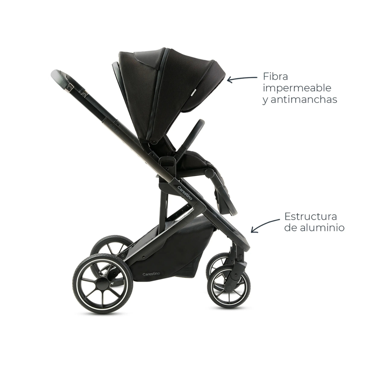 El cochecito GALES cuenta con textiles de alta calidad con tratamientos antimanchas e impermeables, lo que garantiza durabilidad y protección óptima.