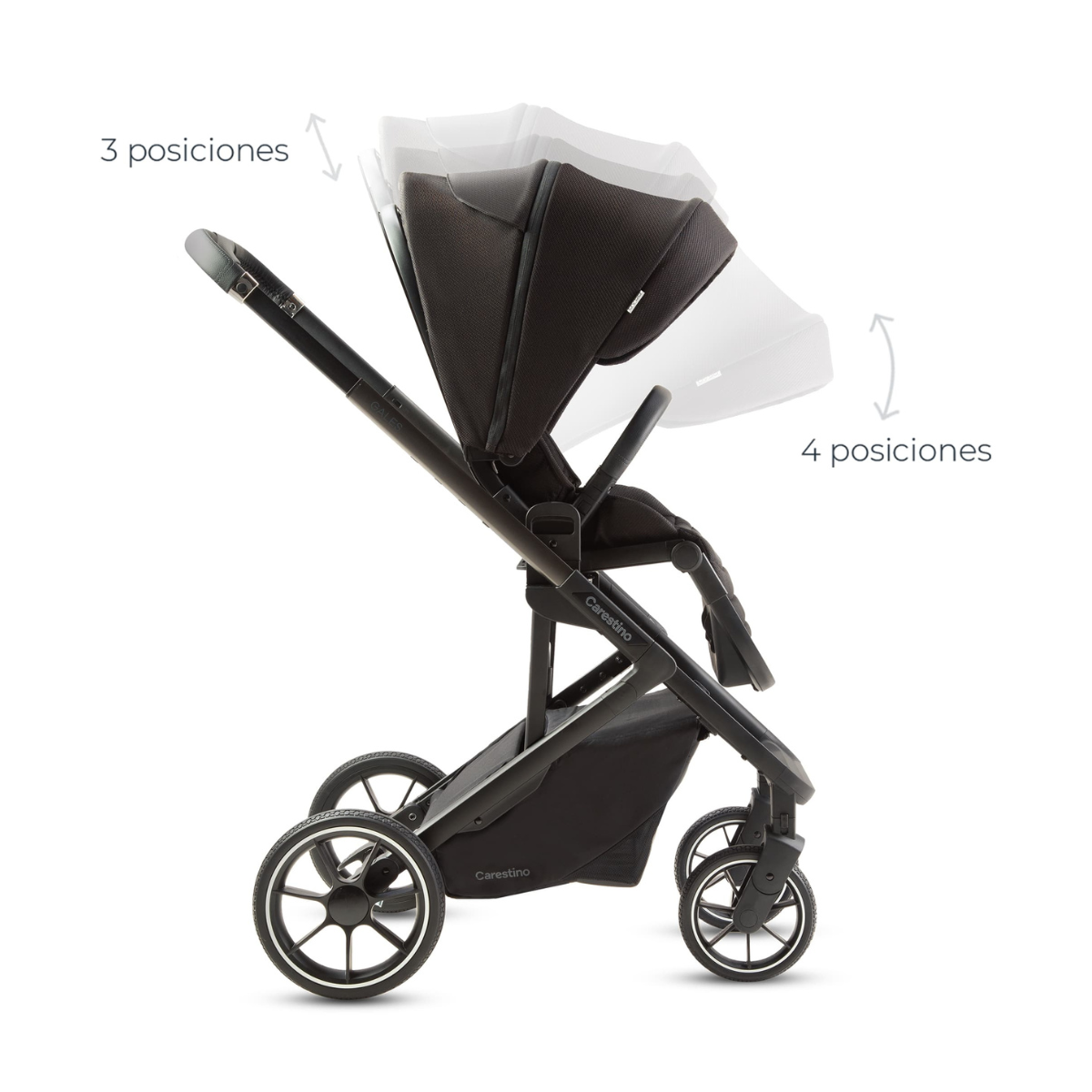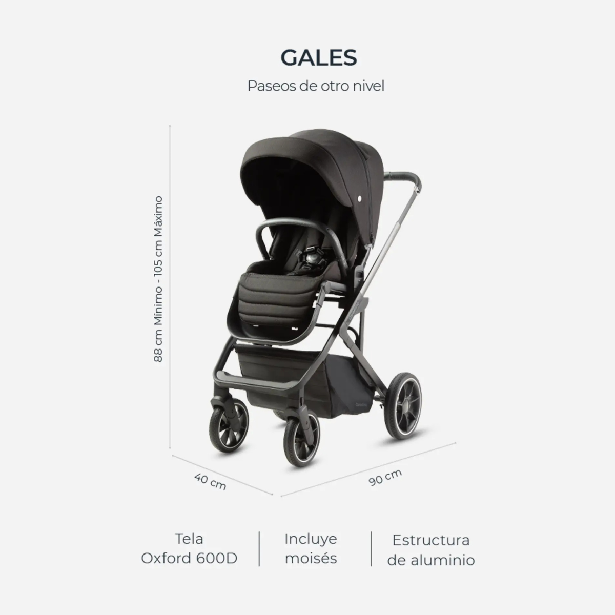 El cochecito GALES se destaca por su innovación y confort, con una capota ajustable en tres alturas que acompaña el crecimiento del bebé y una capota móvil con cuatro posiciones que brinda protección ideal contra el sol y el viento.