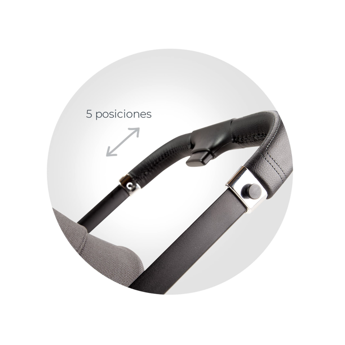 El manillar del cochecito GALES es ajustable en cinco posiciones y está recubierto en ecocuero, brindando un agarre suave y cómodo.