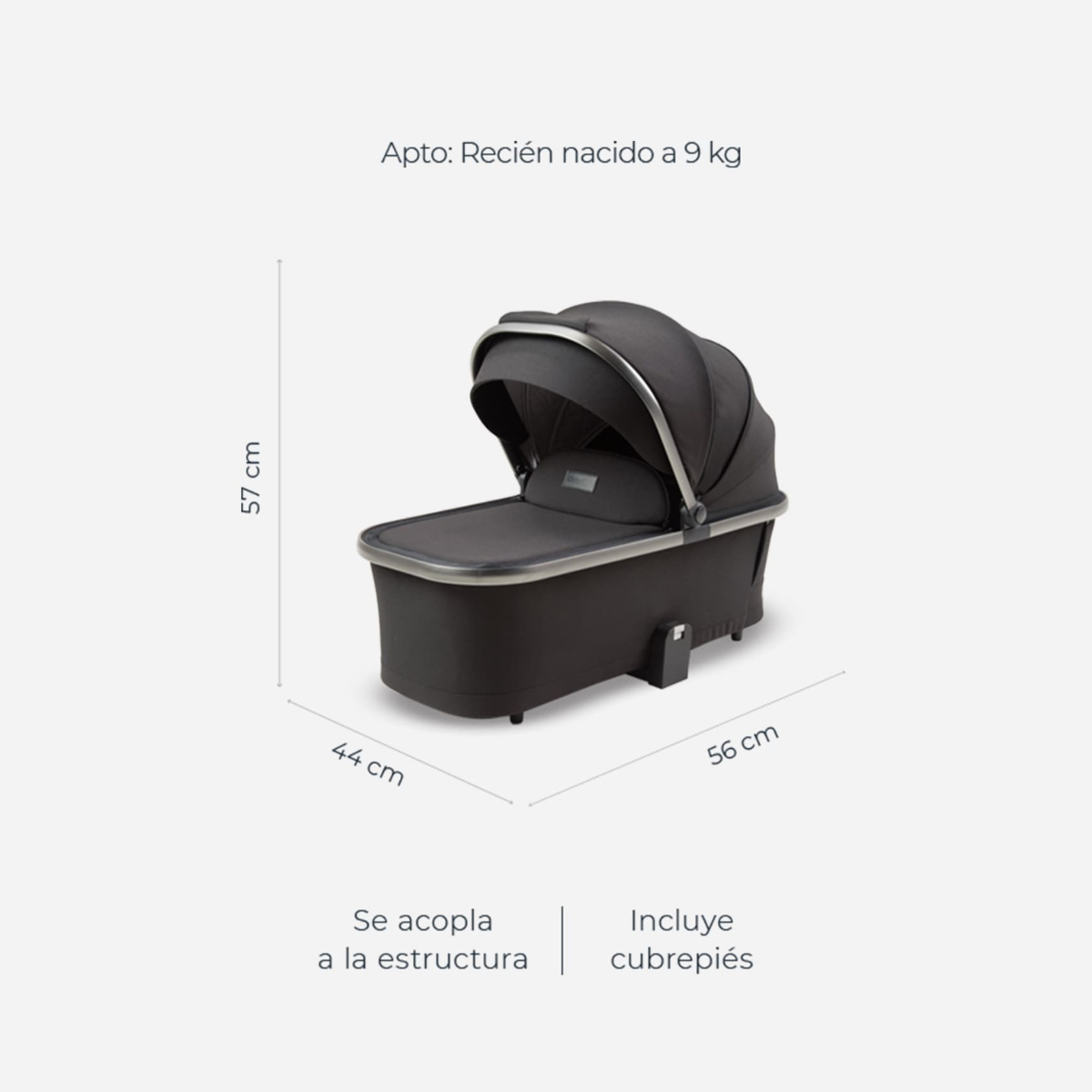 El moisés se acopla fácilmente a la estructura del cochecito y ofrece un espacio amplio y cómodo. Tiene un panel de ventilación frontal, ideal para días calurosos, y se desmonta con una sola mano para usarlo de forma independiente.