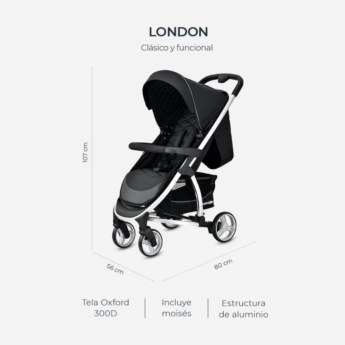 El cochecito LONDON es ideal para toda la etapa de crecimiento del bebé, con un diseño clásico y elegante y detalles de gran calidad.