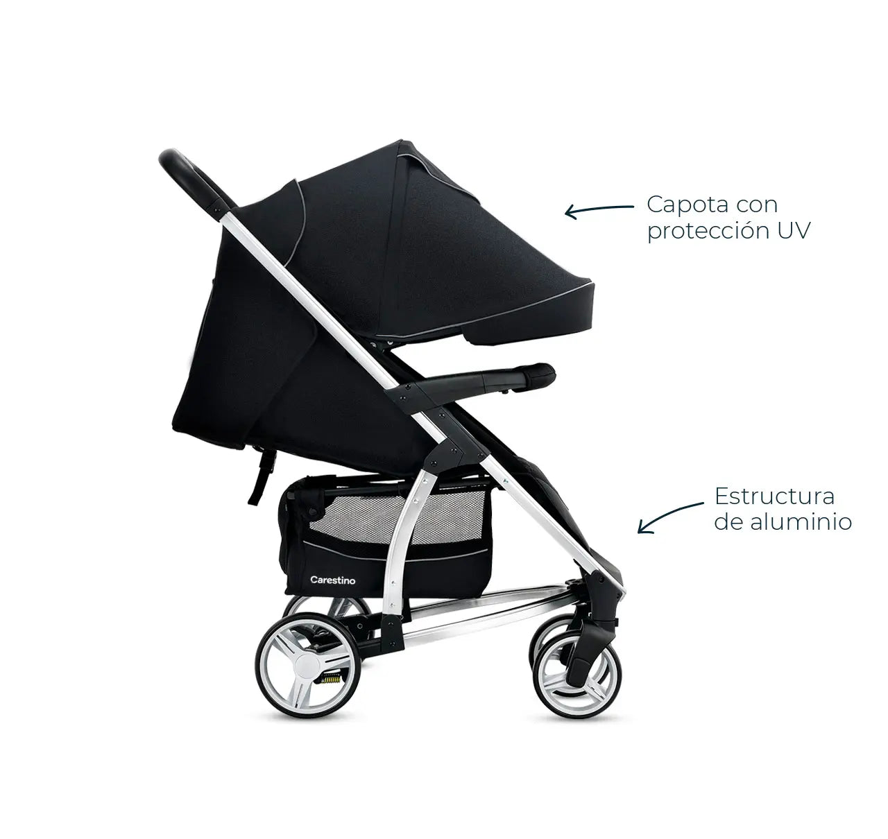 La estructura de aluminio hace el cochecito liviano y resistente, soportando hasta 20 kg.