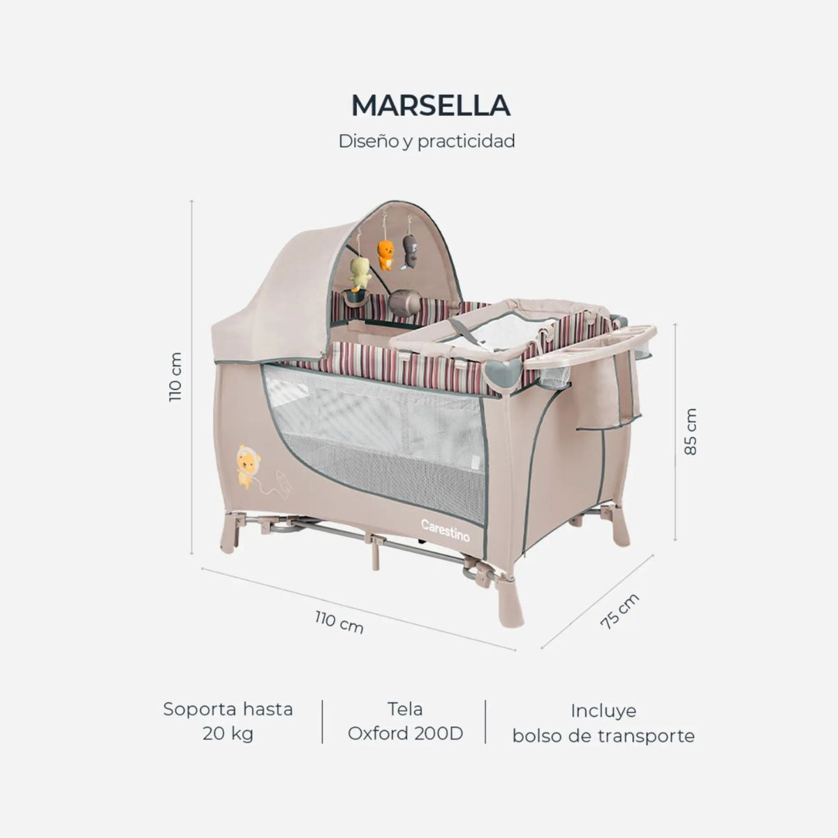 La practicuna MARSELLA se pliega de forma ultra compacta, ideal para guardar y transportar fácilmente. Incluye un bolso de transporte para llevarla con todos sus accesorios, asegurando que tu bebé duerma siempre en un espacio familiar, sin importar el destino.