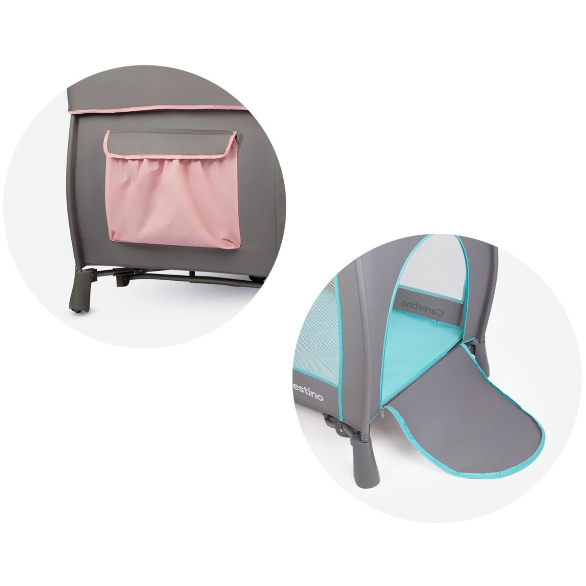 Diseñada pensando en los padres, la practicuna incluye un bolsillo lateral amplio y funcional para guardar accesorios esenciales. En el lado opuesto, tiene una entrada con cierre para juguetes, manteniendo todo organizado y al alcance.
