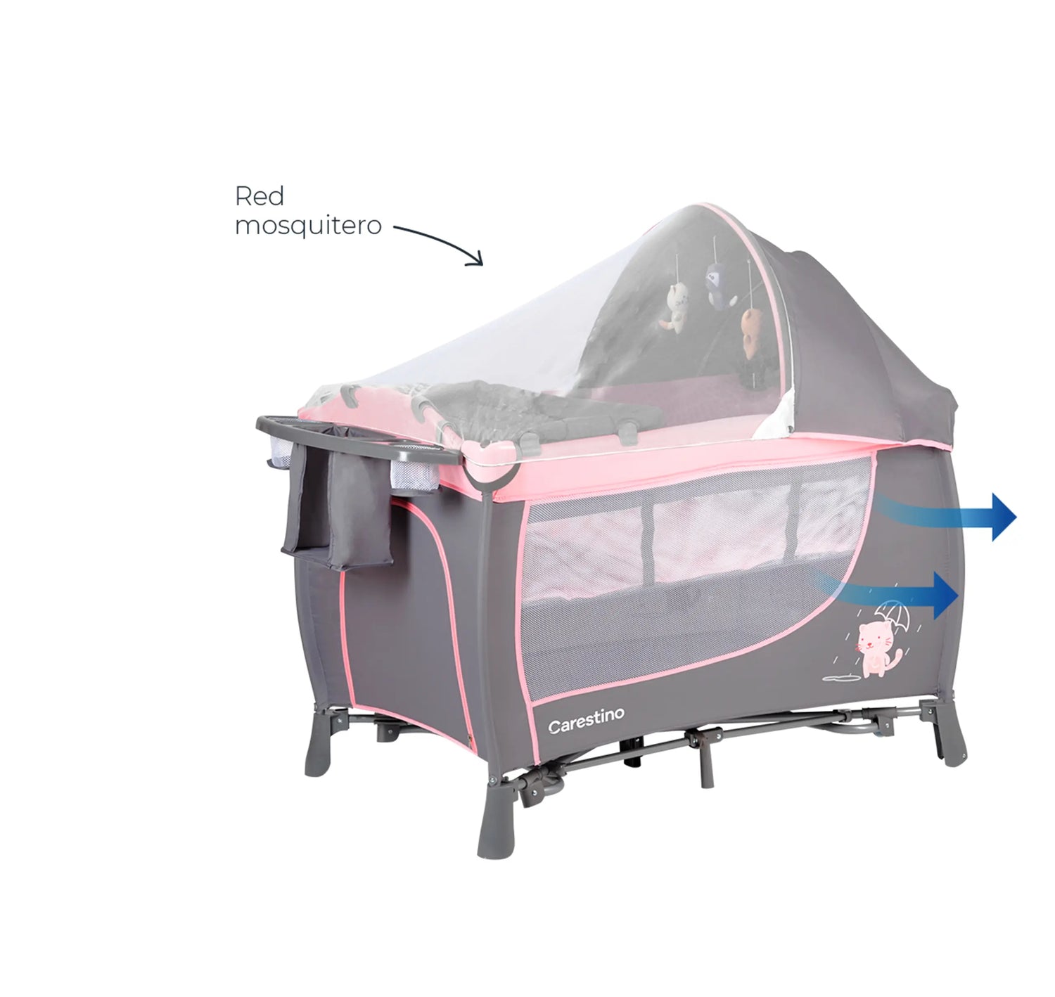 La practicuna incluye una red mosquitero desmontable que cubre toda la superficie, protegiendo al bebé de insectos. Sus tejidos laterales respirables permiten una circulación continua de aire, creando un ambiente fresco y agradable para el descanso.