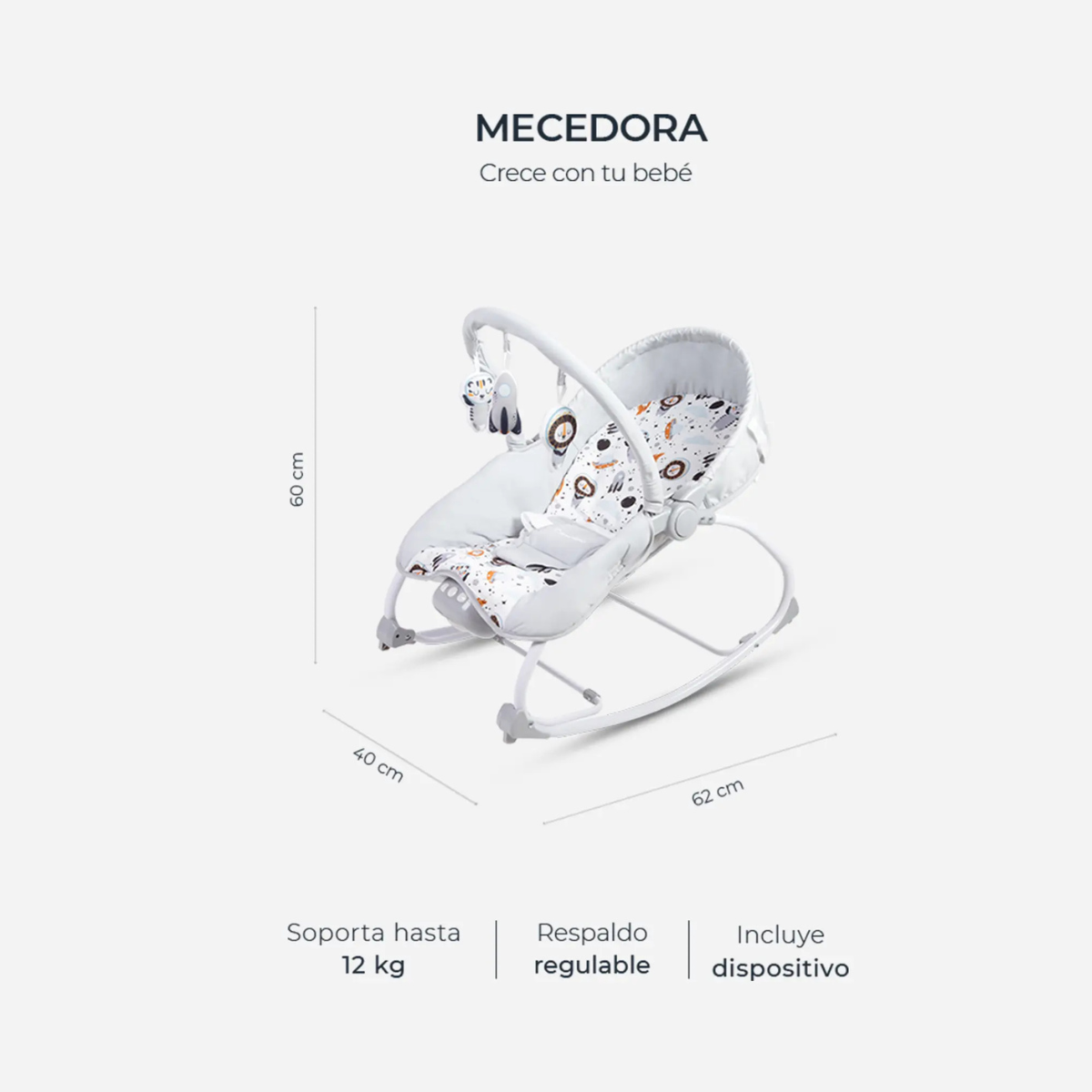 La MECEDORA CARESTINO es ideal para ofrecer a tu bebé un espacio cómodo, seguro y estimulante. Apta desde el nacimiento hasta 12 kg, brinda descanso y relajación, ayuda a calmar el llanto y favorece el desarrollo sensorial y cognitivo.