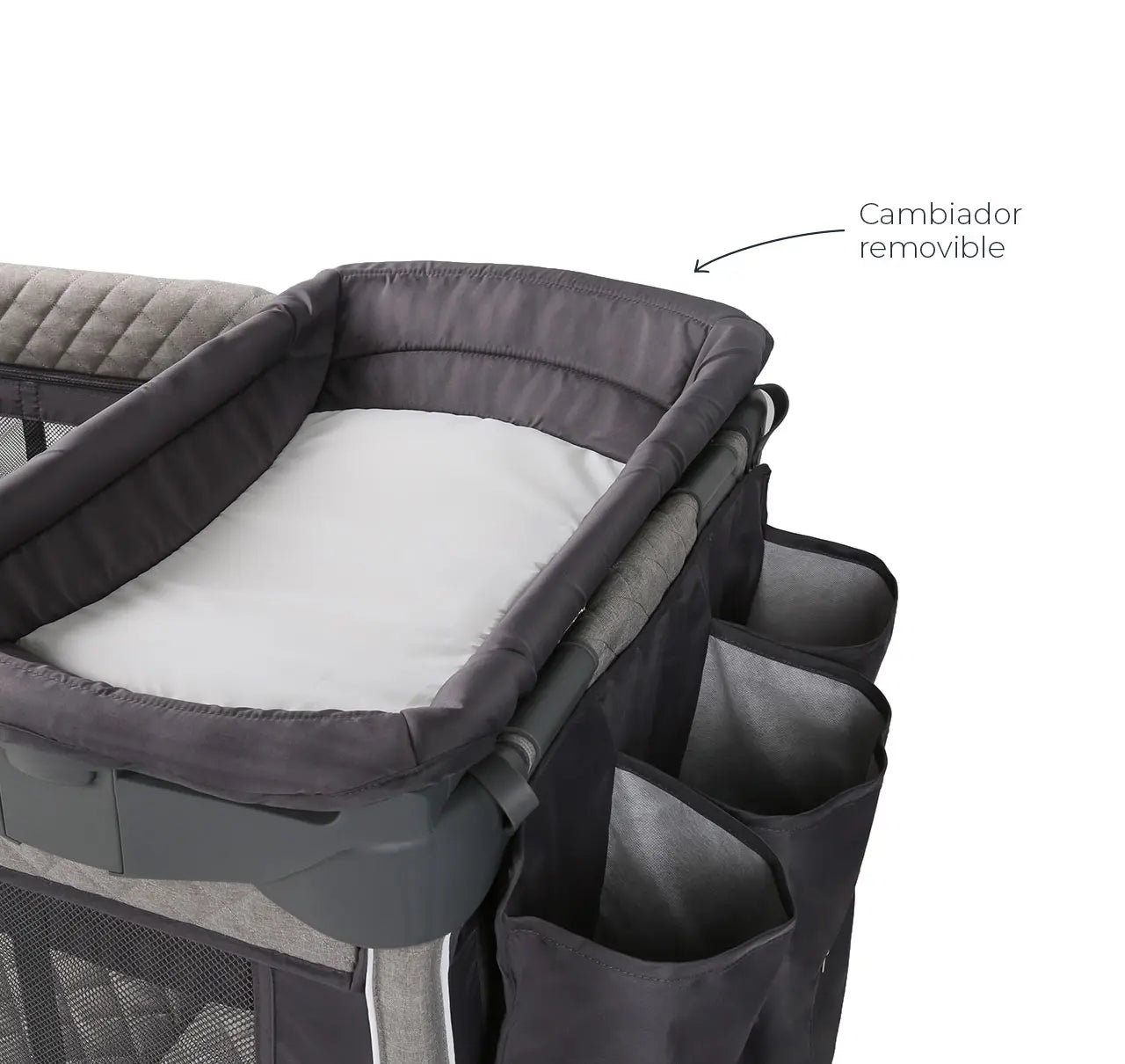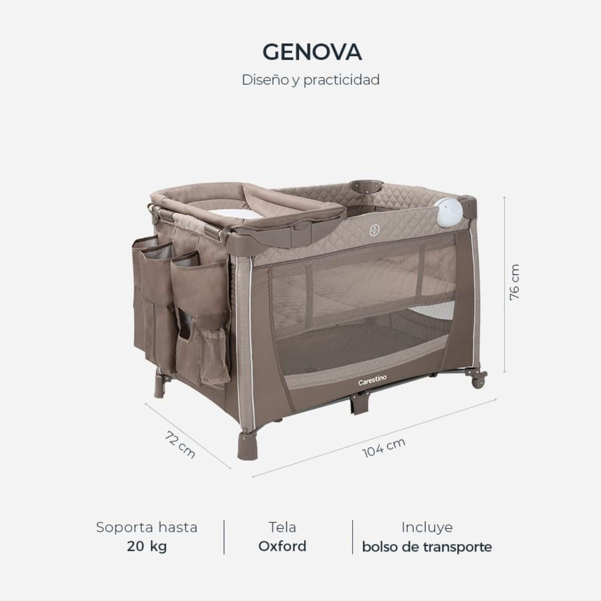 La practicuna GENOVA incluye un cambiador removible que soporta hasta 10 kg, brindando un espacio seguro y cómodo para cambiar al bebé.