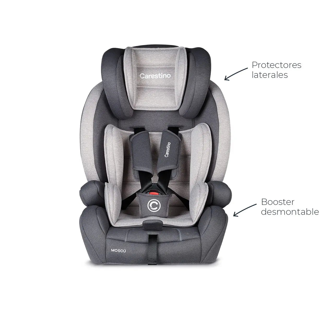 La butaca MOSCÚ tiene un arnés de seguridad de 5 puntos que sujeta hombros y cadera, brindando máxima protección.