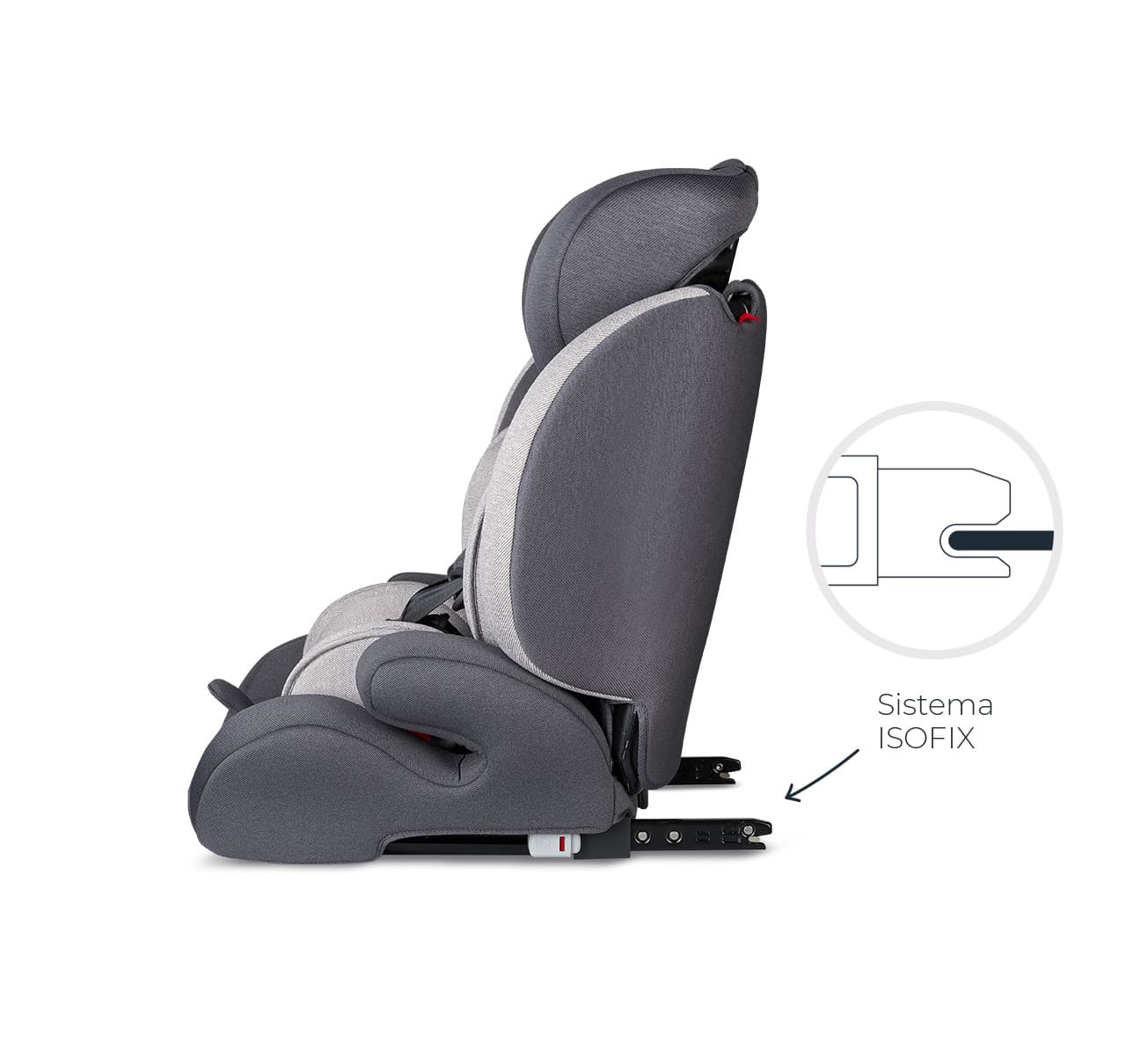 Cuenta con anclaje ISOFIX y guías de cinturón para una instalación rápida y segura. Si el vehículo no tiene ISOFIX, se puede usar con cinturón de 3 puntos.