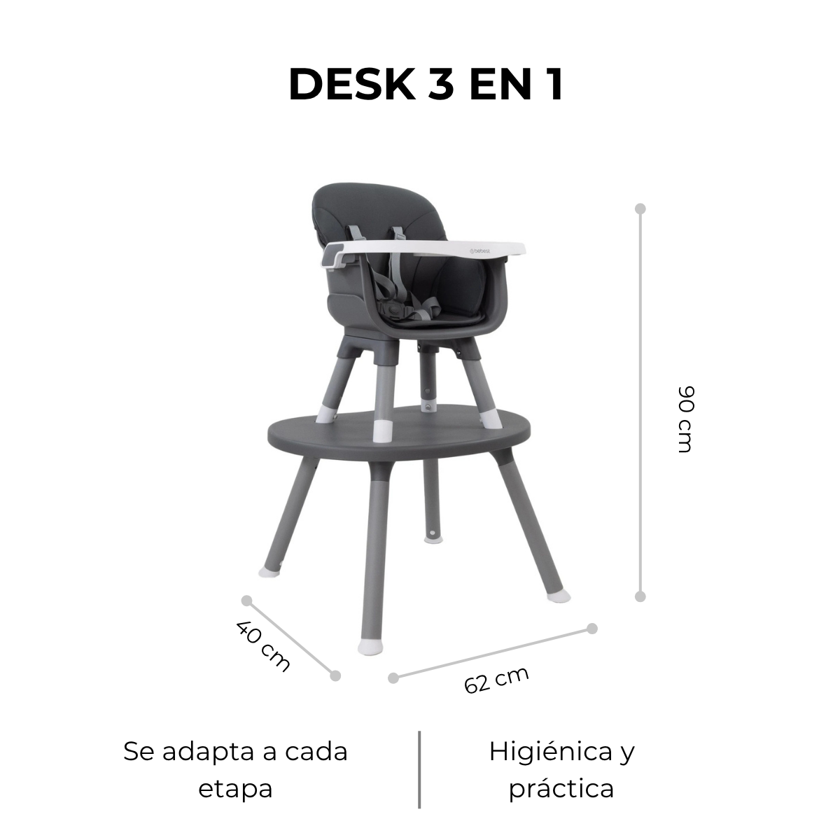 La silla de comer Baby Desk 3 en 1 acompaña a tu bebé en su crecimiento con un diseño versátil que funciona como silla de comer, independiente o escritorio. Tiene una bandeja ajustable para mayor comodidad y un tapizado acolchonado removible fácil de limpiar. El montaje es rápido y sin herramientas, y está disponible en dos colores.
